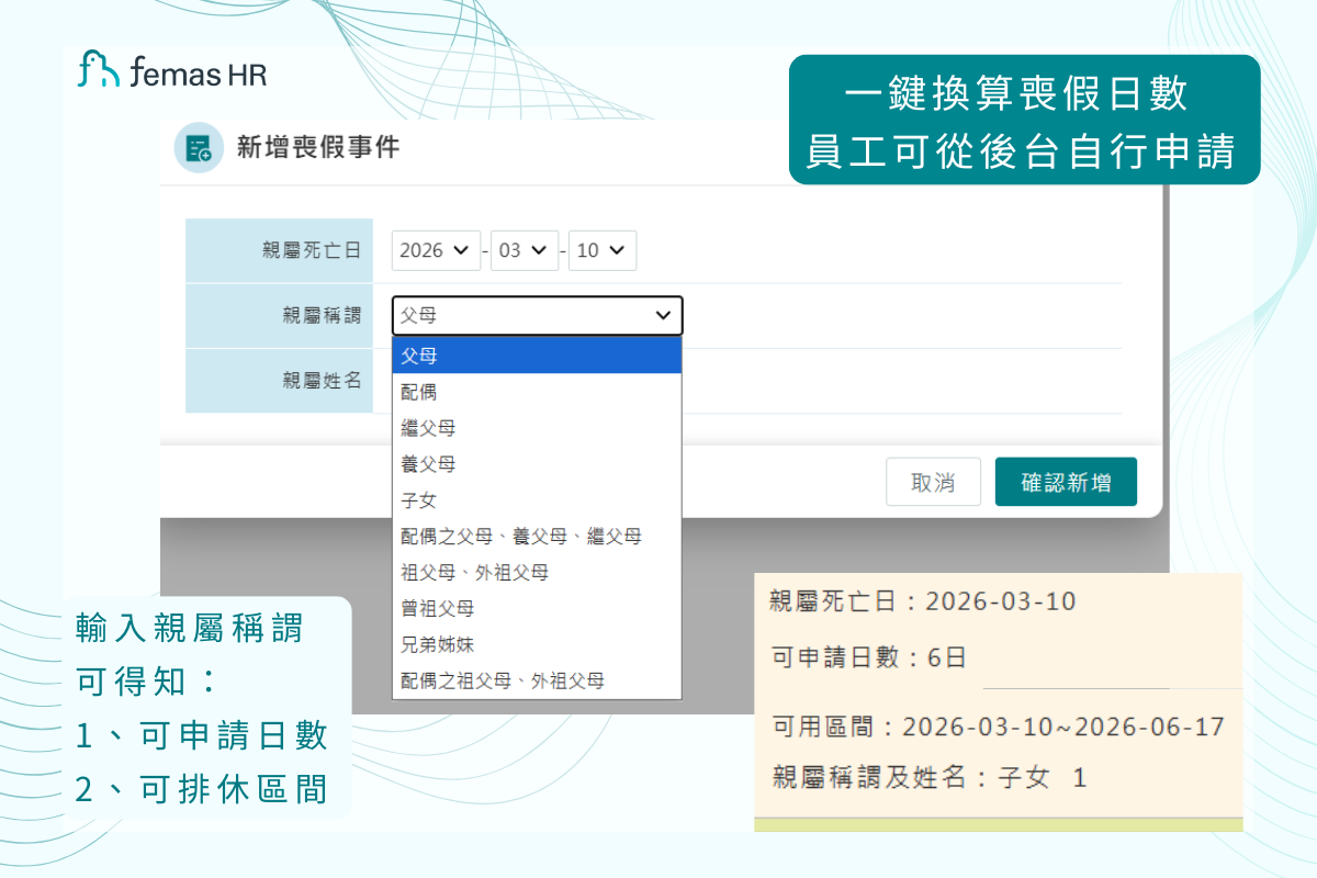 喪假同時具人道關懷與法規嚴謹特性,企業應謹慎處理、體察勞工心情 。考勤系統若能支援「分次簽核」與「累計天數監控」,可避免人為帶入天數錯誤(附圖為 Femas HR 人資系統範例) 。