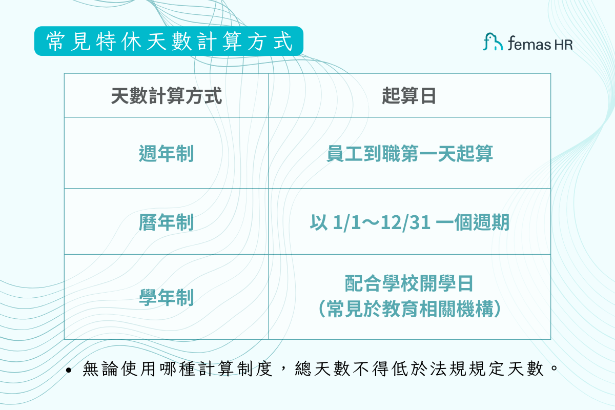 企業可選擇「週年制」、「曆年制」或「學年制」,計算方式如下: