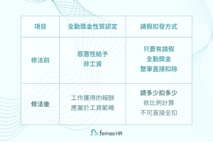 更多全勤獎金新制與病假扣全勤規定,請見 Femas HR 鋒形雲端人力資源系統【2026 勞工病假新制兩大保障】 文章