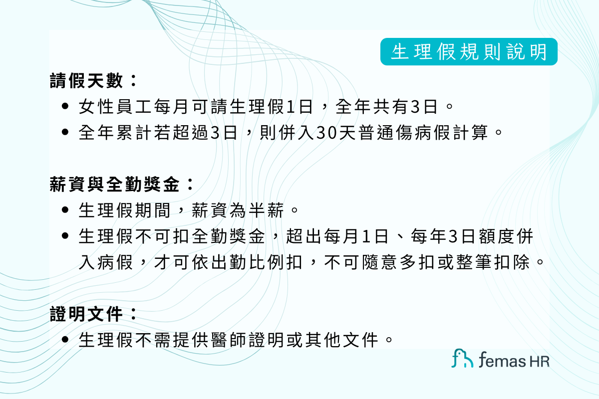 生理假的法源依據不是《勞基法》,而是《性別工作平等法》,根據規定,員工請生理假不須提供醫療證明,亦不得扣全勤獎金、考績或其他不利處分,生理女性員工,每月可請 1 天,每年最多有 3 天「半薪生理假」額度。