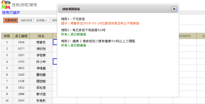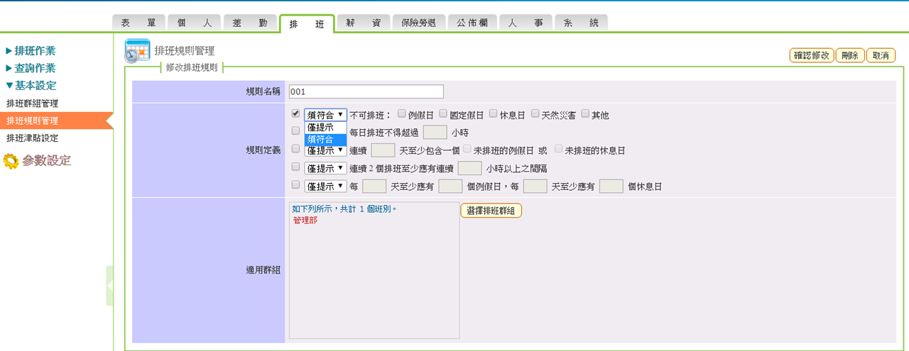 進行排班時,常會擔心是否有符合法令,但以人工進行檢查往往耗時費心,因此我們新增了排班規則管理,透過設定讓系統自動檢查班表是否有符合相關法規。設定方式如下:1.請先至: 排班-->基本設定-->排班規則管理:點選[新增]按鈕創建新的規則 或點選[修改]按鈕編輯原有規則2.進行排班並檢核:進行排班時,若此班表已有對應之排班規則,則按下[儲存]後會自動進行檢查。檢查通過會在顯示排班規則訊息所有人員日期通過,若不符合規則也將提示人員於哪些時段不符合規定。