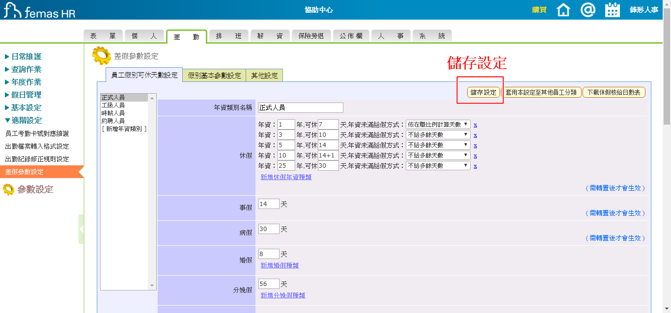 步驟一:設定假別參數請至差勤→基本設定→假別管理→實際假別設定:點[新增]且輸入假別名稱來新增假別。步驟二:設定假別天數請至差勤→基本設定→假別管理→實際可休天數設定:點選年資類別(如 :正式人員)進入設定畫面。輸入自訂假別可使用天數且儲存。步驟三:設定假別規則請至差勤→基本設定→假別管理:點右上方[新增]按鈕。輸入假別代碼,假別名稱與相關規則※新增完假別後,可至表單來作申請,並可以從請假畫面中來看到天數。