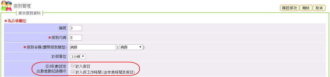 請先至 差勤→基本設定→假別管理:確認以下紅色框處設定