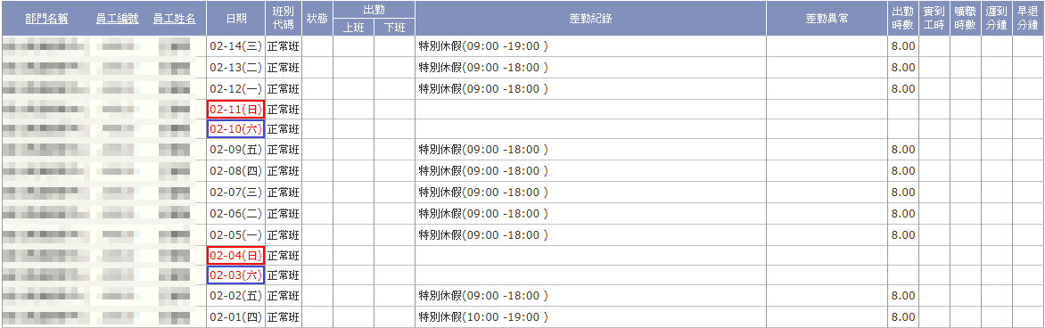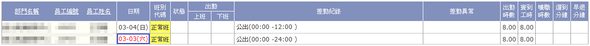 出勤資料中的 "差勤紀錄" 顯示方式,與【假別管理】中的設定:計入假日、計入非工作時間有關。