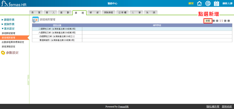 請至排班→基本設定→排班規則管理:點右上方[新增]按鈕