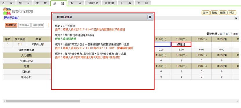 進行排班,按下儲存後會自動進行檢查,排班規則訊息即會顯示各項規則提示。