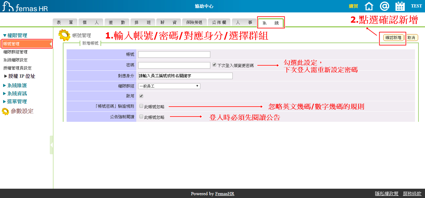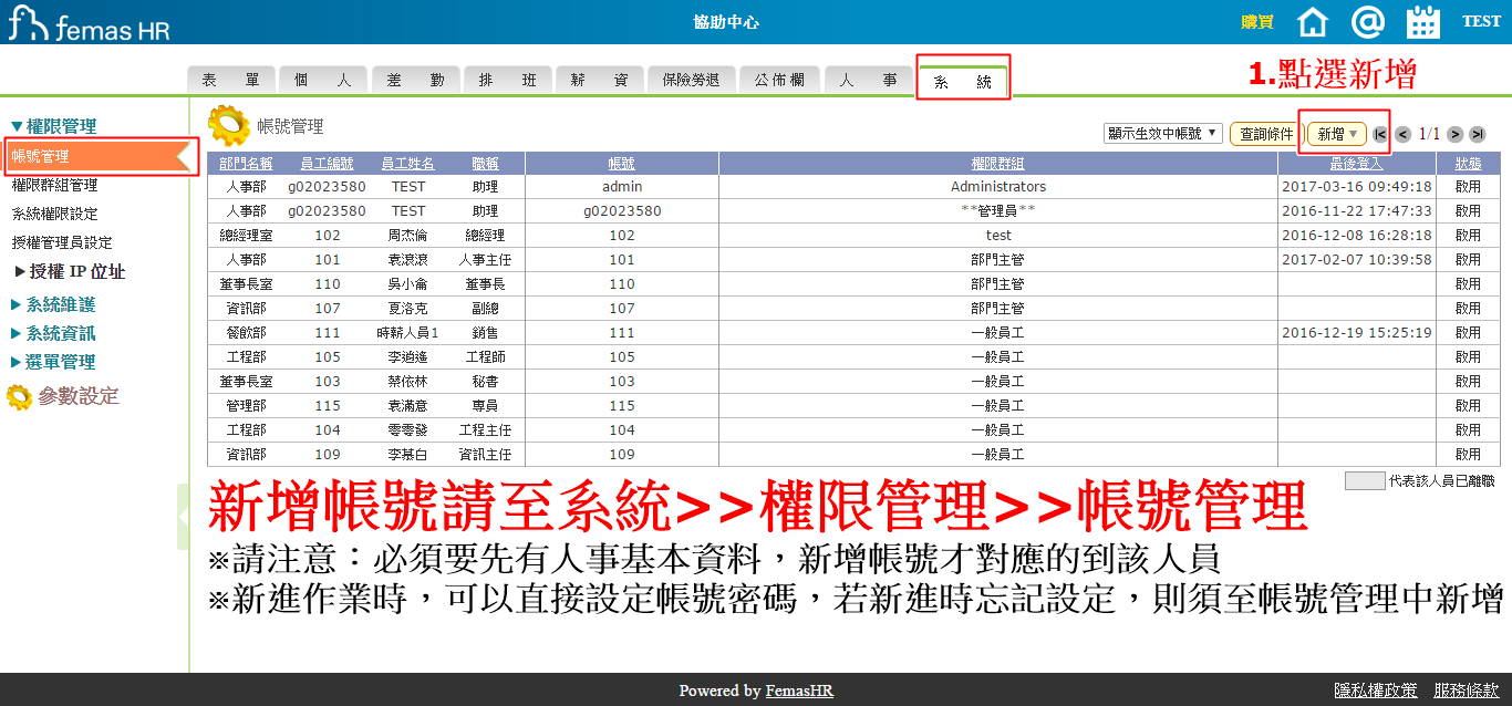 請至系統→權限管理→帳號管理:點右上方"新增"按鈕