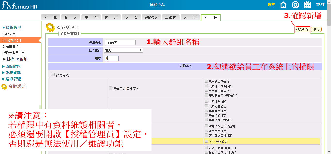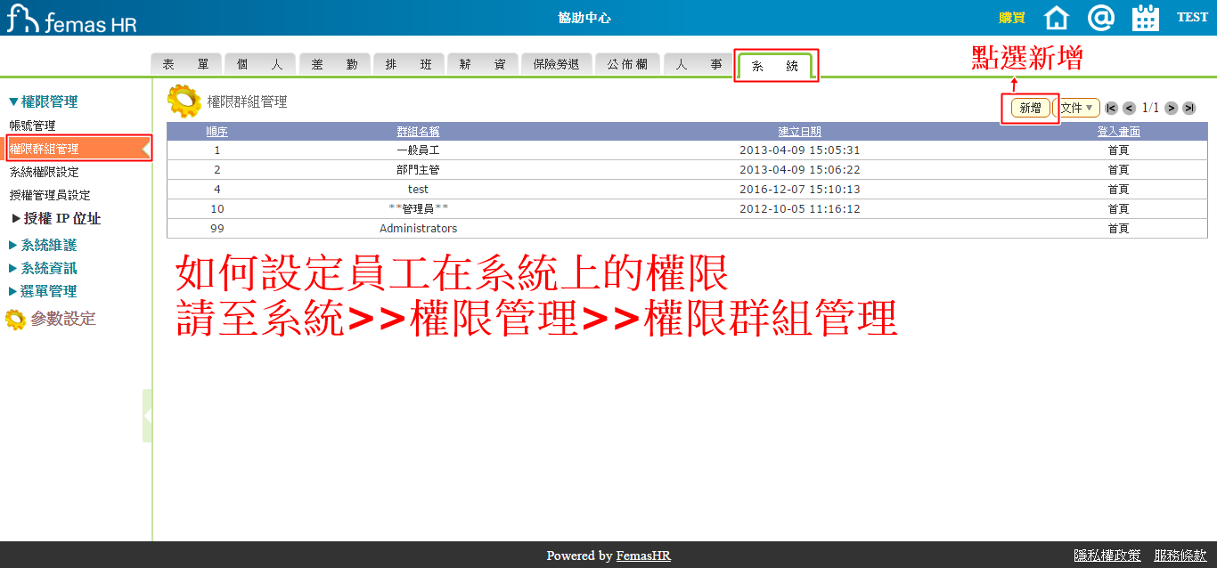 步驟二:如何設定員工的權限(群組),請至系統→權限管理→權限群組管理