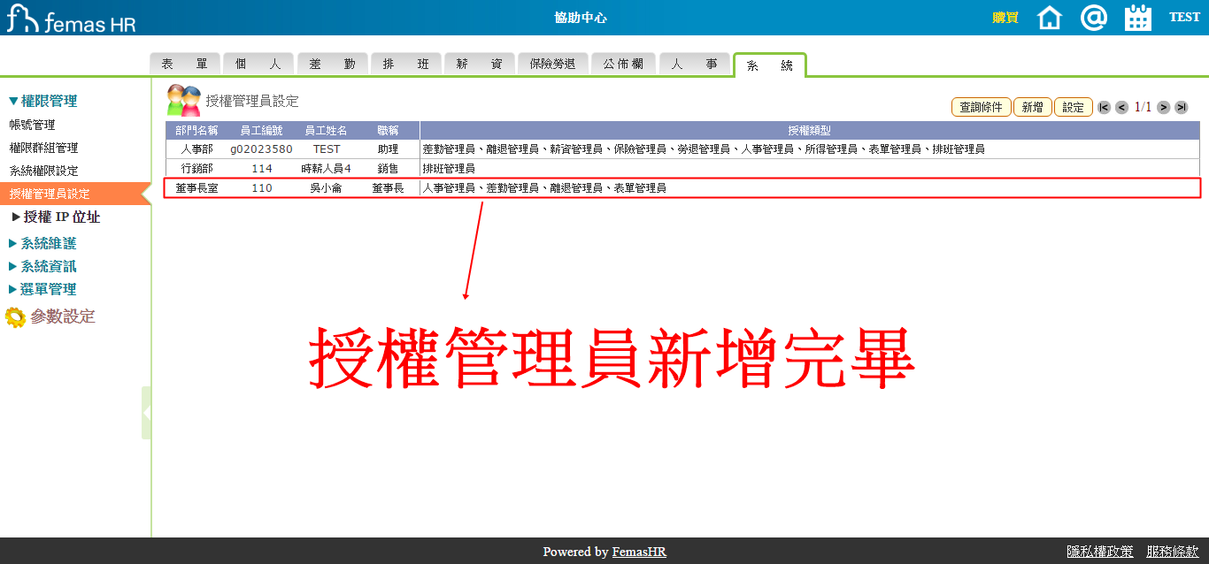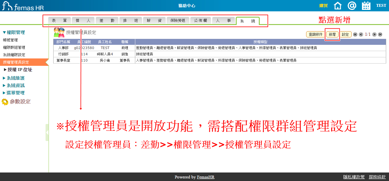 - 要設定管理對象授權,是以人的真實身份授權,而非帳號。如:使用者姓名是王小明,他可以具備差勤管理權,並且可以管理全公司。