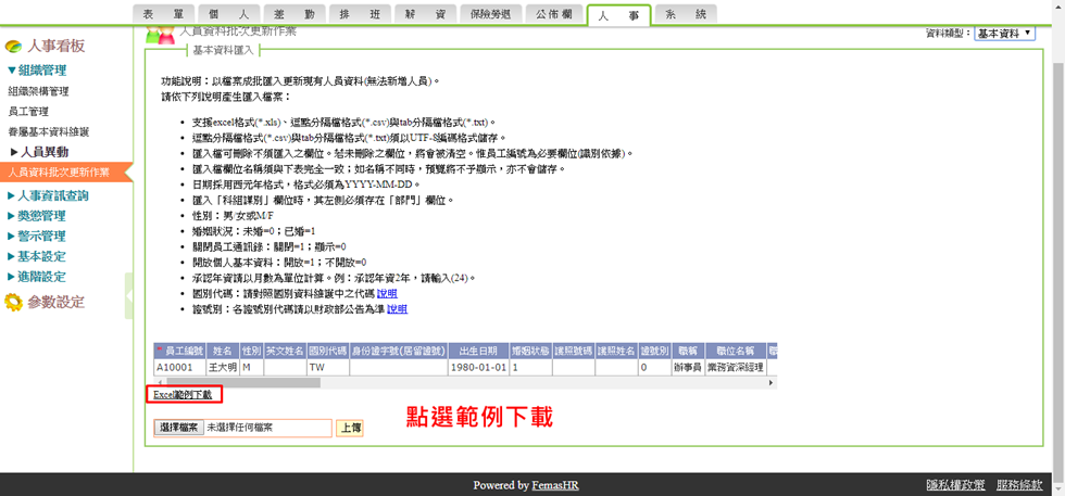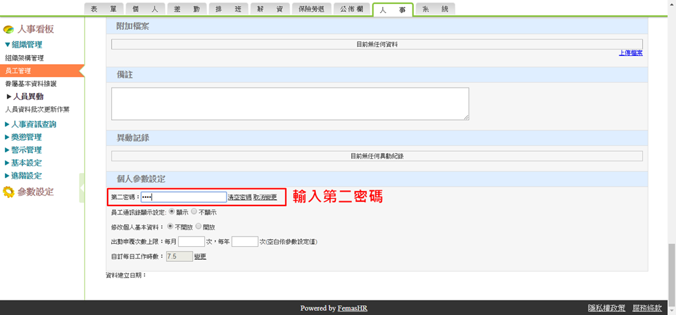 單筆設定第二密碼:請至人事→組織管理→員工管理→點選員工,在"第二密碼"欄位內輸入密碼→確認修改。批次設定第二密碼: 請至人事→組織管理→人員資料批次更新作業,點選Excel範例下載,填寫後將檔案儲存並上傳即可。