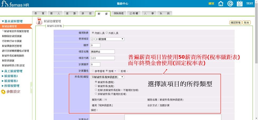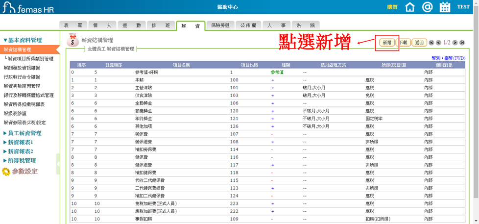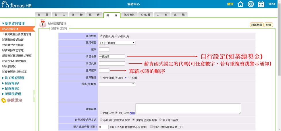 一.請至 薪資➜薪酬規劃➜薪資結構管理:點右方"薪資結構(項目及公式)"進入二.按右上方"新增"按鈕三.使用項目:請選擇(#)一般參考值項、(+)一般加項、(-)一般扣項,輸入完成後按"確認新增"即可。