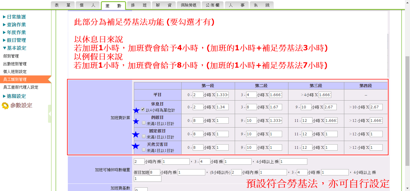 步驟一:選擇員工類別請至差勤→基本設定→員工類別管理 :點選欲設定員工類別步驟二:輸入加班費率(1)僅以加班承認時數計算=>適合每日出勤8小時人員使用(2)合併每日出勤與加班計算:加班承認時數+額定工時/出勤時數/實到工時=>針對每日出勤時數不定的時薪人員使用。