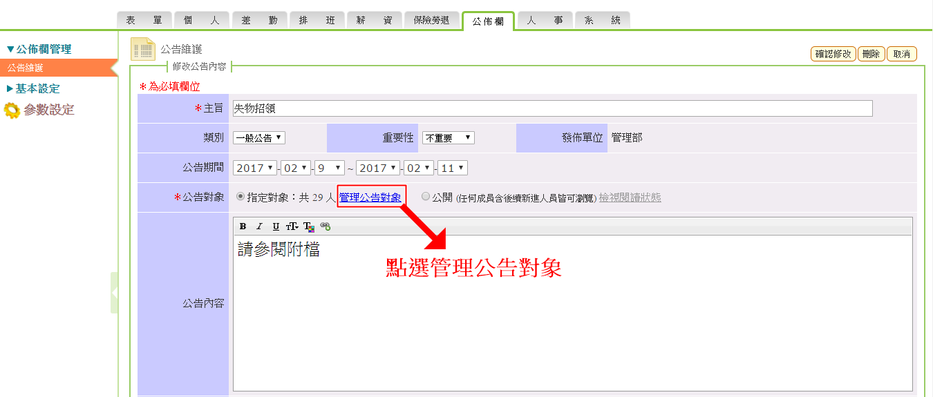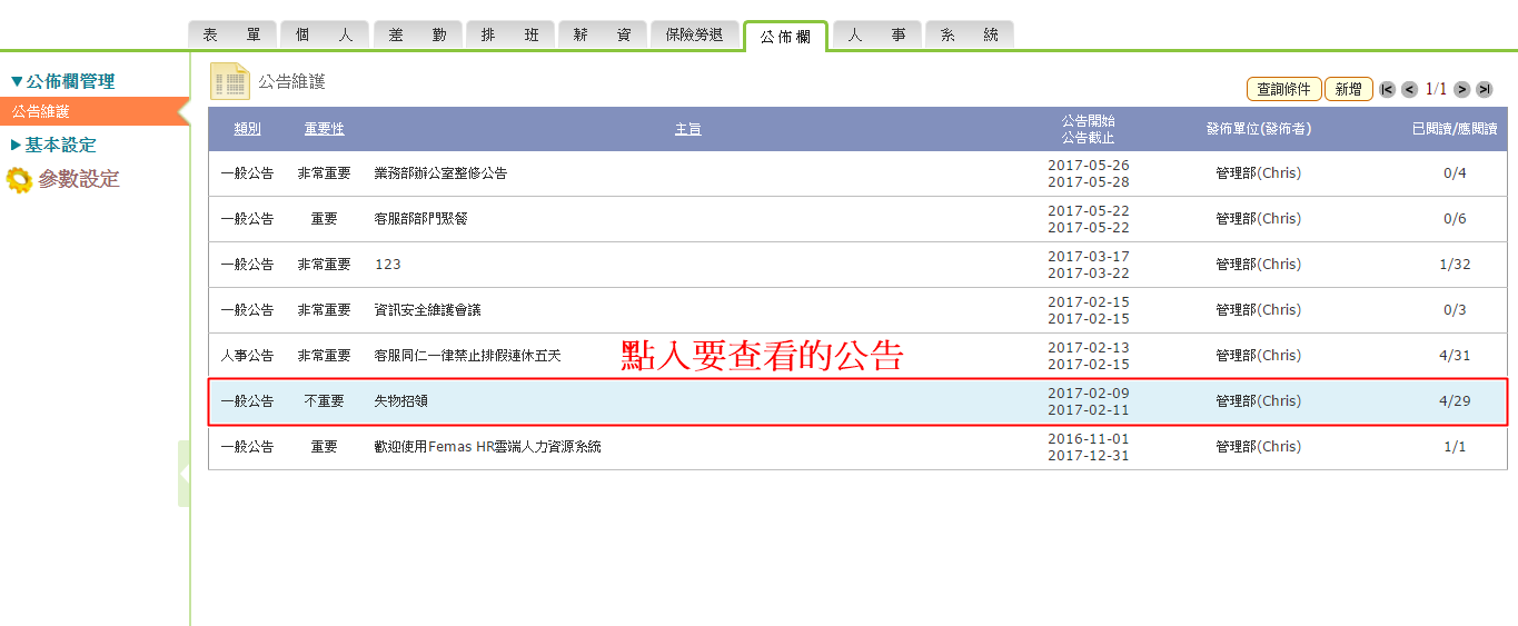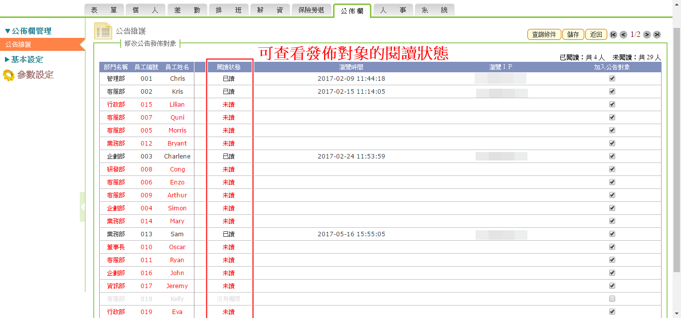 請至公佈欄→公佈欄管理→公告維護,點選已發布的公告查看公告對象欄位。1.若公告對象選擇為指定對象,可點選「管理公告對象」查看。2.若是選擇為公開,則可點選「檢視閱讀狀態」查看。為避免員工都不點入查看公告,建議可至公佈欄→參數設定→01開啟強制閱讀公布欄訊息的設定。
